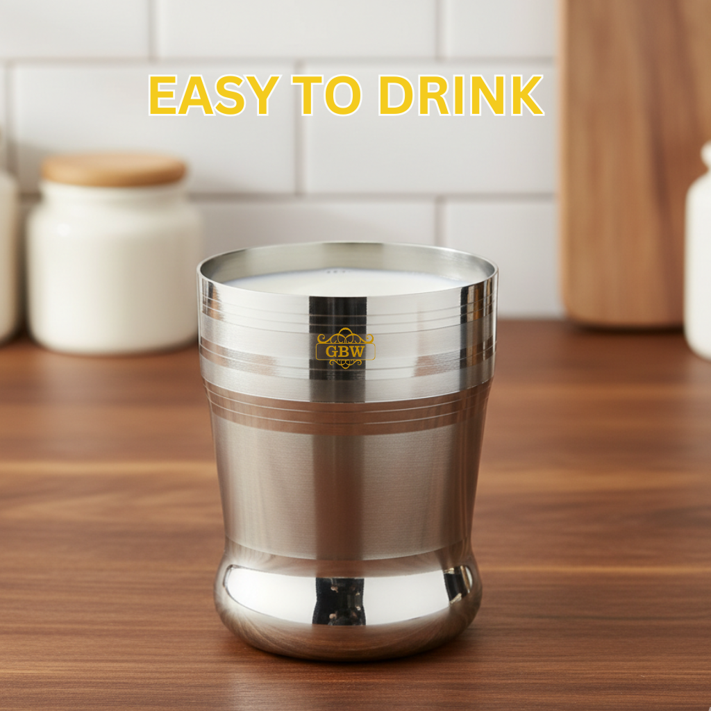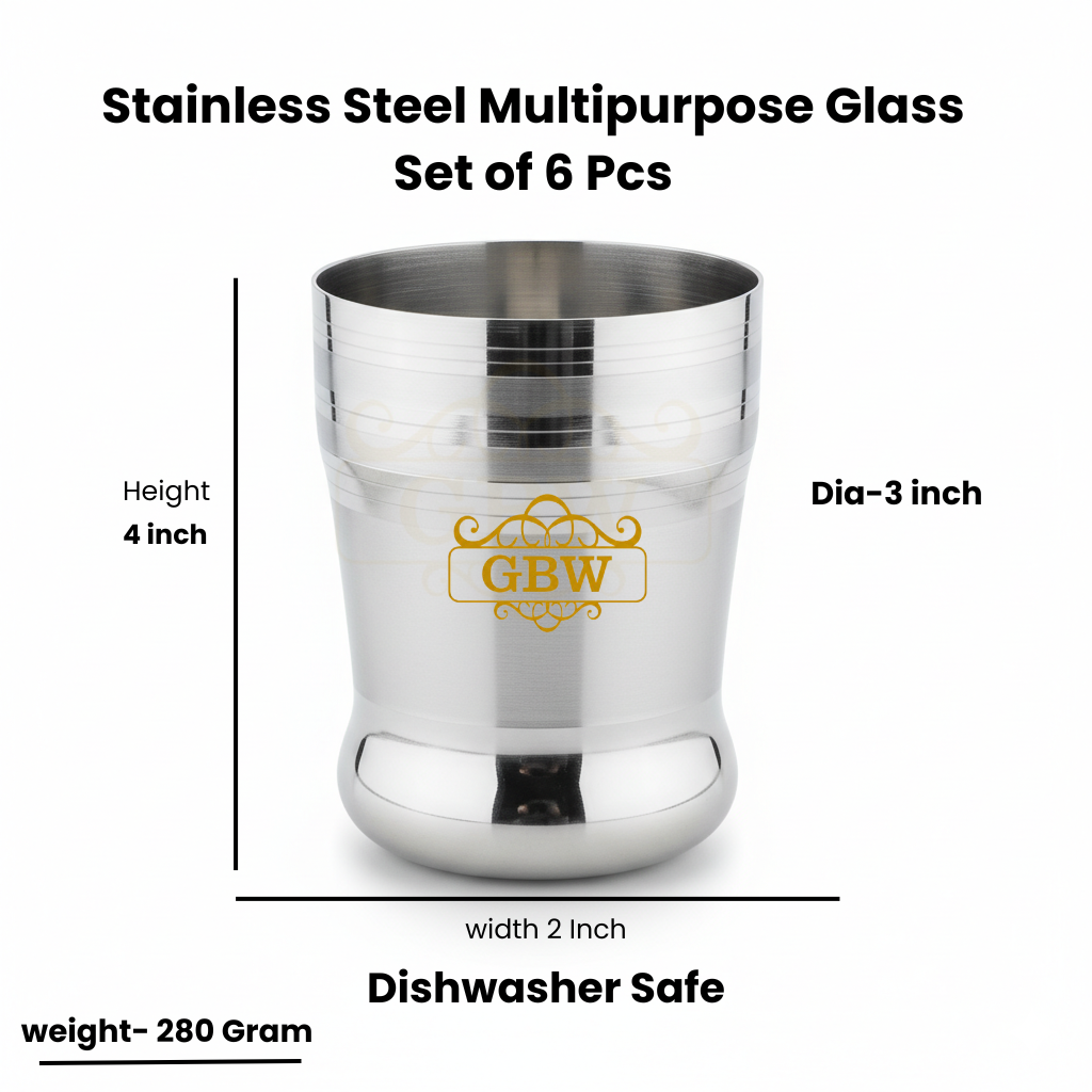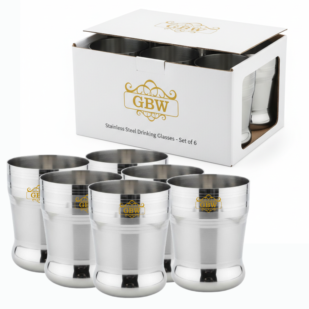 Pack of 6 Stainless Steel Water & Juice Glass Set (300 ml each). Crafted from high-quality food-grade stainless steel, these glasses are strong, rust-resistant, and designed for long-lasting daily use. Perfect for serving water, juice, lassi, buttermilk, soft drinks, and other beverages, this steel glass set is ideal for home, kitchen, office, restaurants, and outdoor use. Unlike plastic or fragile glass tumblers, these stainless steel glasses are unbreakable, hygienic, and easy to clean. With a sleek mirror finish and smooth rounded edges, these glasses add a modern yet traditional touch to your dining table. Their 300 ml capacity makes them suitable for both adults and kids. A practical and durable addition to your kitchen essentials, and also a great gifting option for housewarming, weddings, and festive occasions.